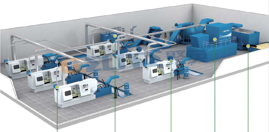 多工位集中油霧凈化治理適用于機(jī)床數(shù)量規(guī)模較大,或者多臺(tái)、多種類型開放式機(jī)床,通過吸氣罩或吸氣臂形式收集油霧氣體,并且有條件設(shè)置排氣筒的情況,前端收集油霧氣體,通過管道集中輸送到凈化主機(jī)中過濾凈化后,通過風(fēng)機(jī)和煙囪潔凈空氣排入大氣